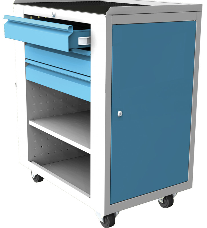Színek: korpusz RAL 7035 halvány szürke/RAL 5012 világos kék fiókok és ajtó/