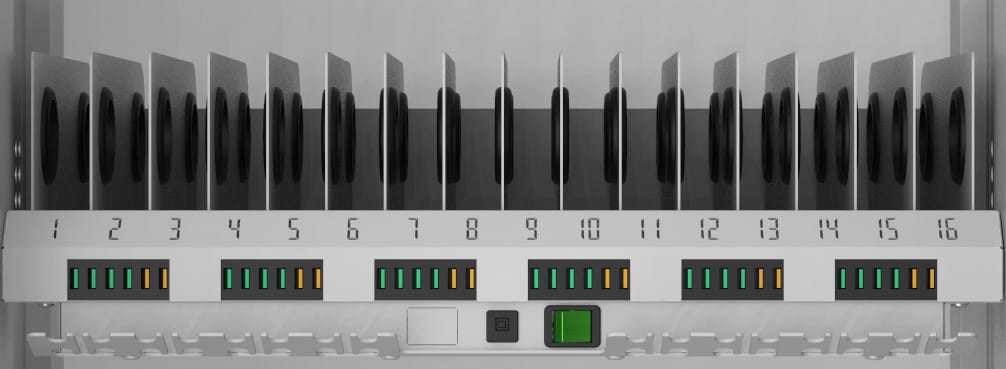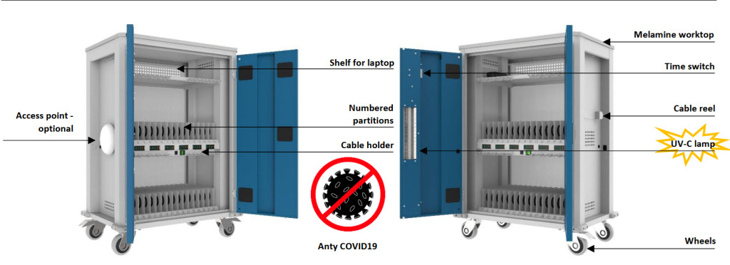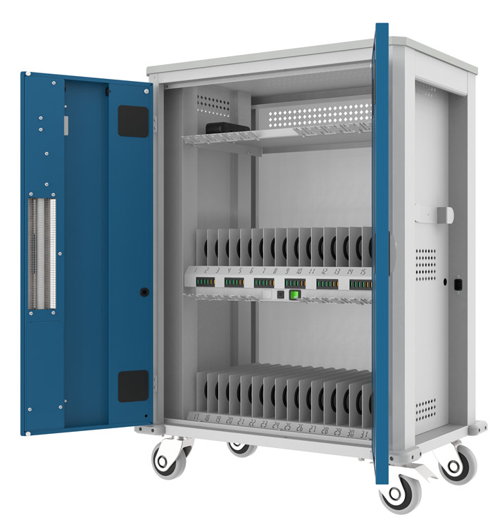 A tabletek, telefonok sorszámozott fakkokban helyezhetők el, az elválasztó lemezeken műanyag ütközők védik az eszközöket a karcolódástól, csúszkálástól