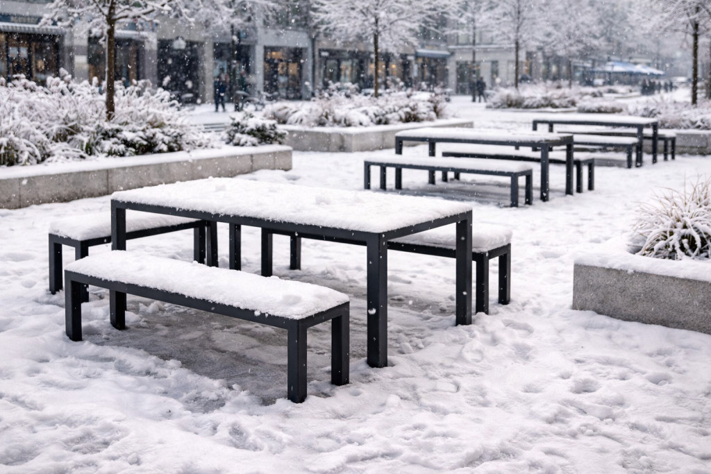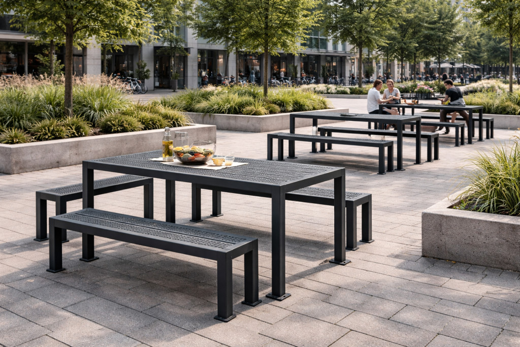 Az asztal és pad tökéletesen illeszkedik egymáshoz – letisztult, városi design.