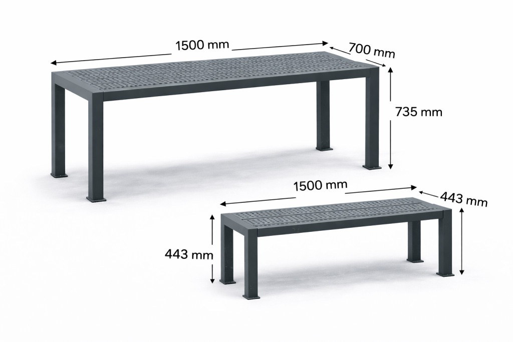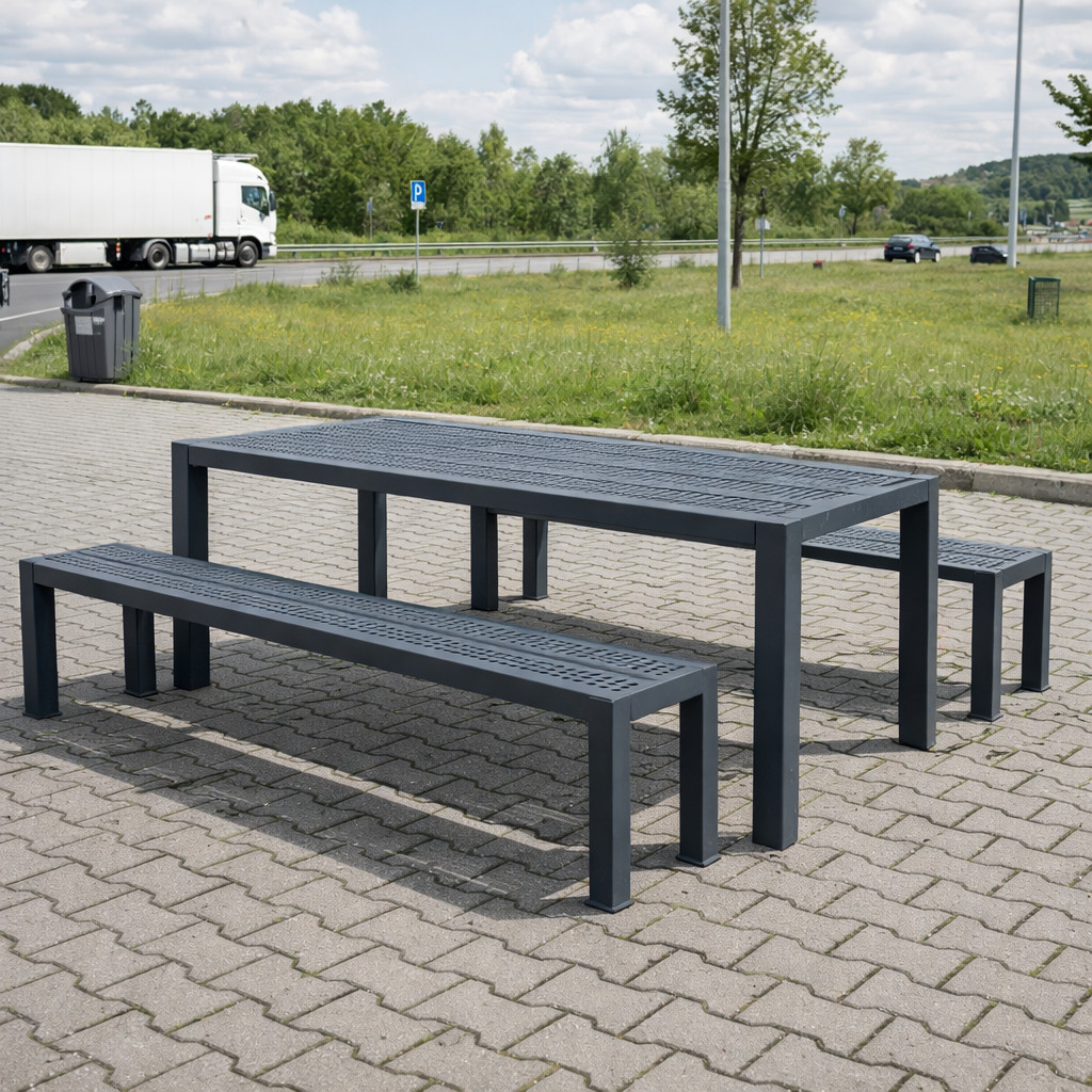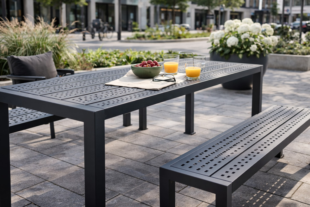 Az asztal és pad tökéletesen illeszkedik egymáshoz – letisztult, városi design.
